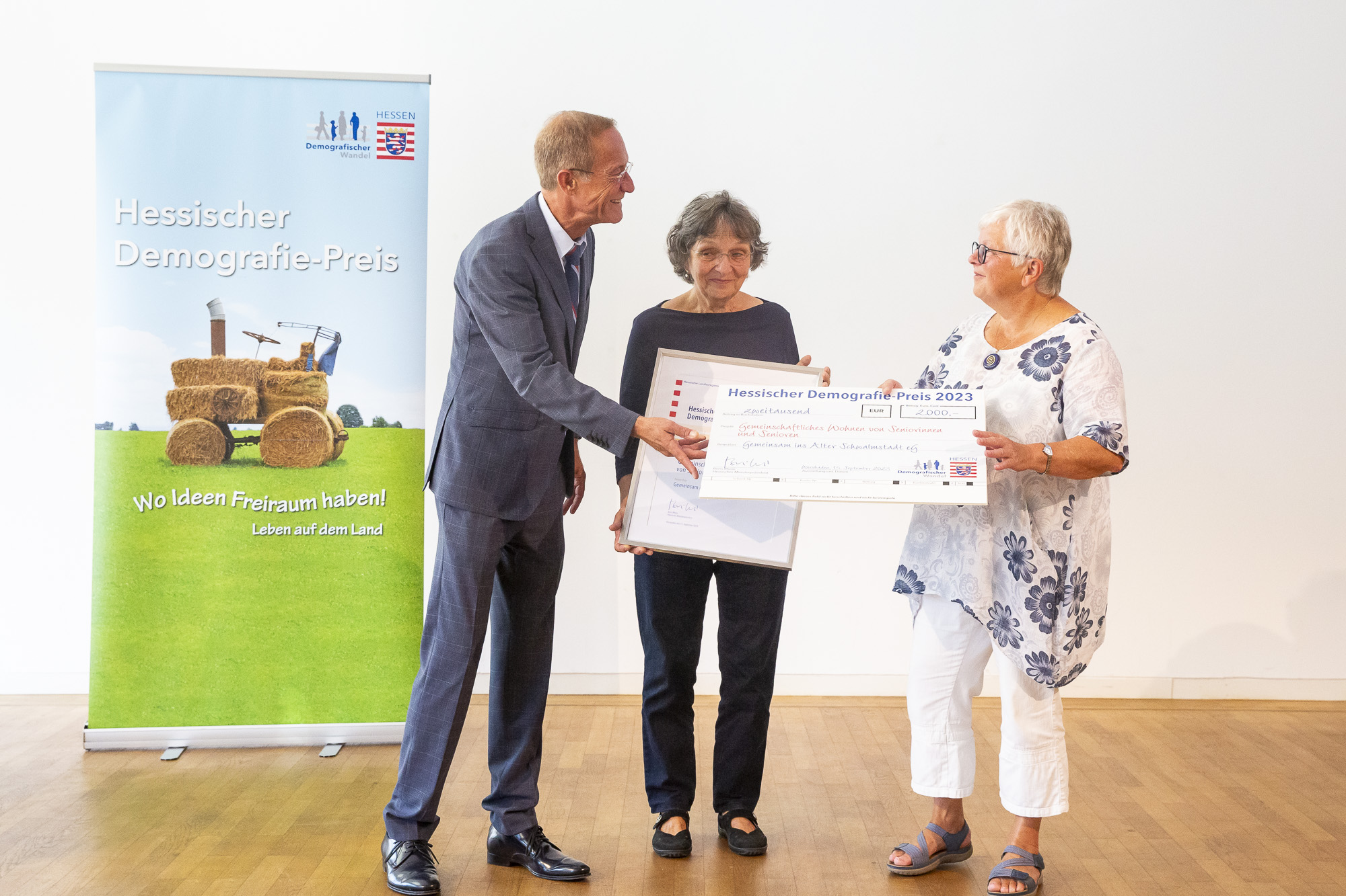 Der Chef der Hessischen Staatskanzlei und Demografie-Beauftragte der Landesregierung, Staatsminister Axel Wintermeyer, hat das Wohnprojekt „Gemeinsam ins Alter Schwalmstadt e.G.“ aus Schwalmstadt-Treysa mit dem dritten Platz beim Hessischen Demografie-Preis 2023 ausgezeichnet.