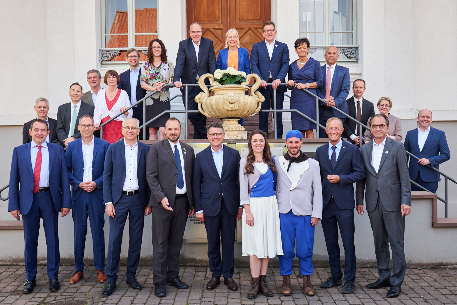 (v.r.n.l.): Christa Kreis, Marie Ludwig, Thilo Hanke, Tobias und Christian Pfeifer, Julian Zell, Jochen Richard Knoblauch und Benedikt Weber sind von Ministerpräsident Boris Rhein (Mitte) als „Menschen des Respekts“ ausgezeichnet worden.