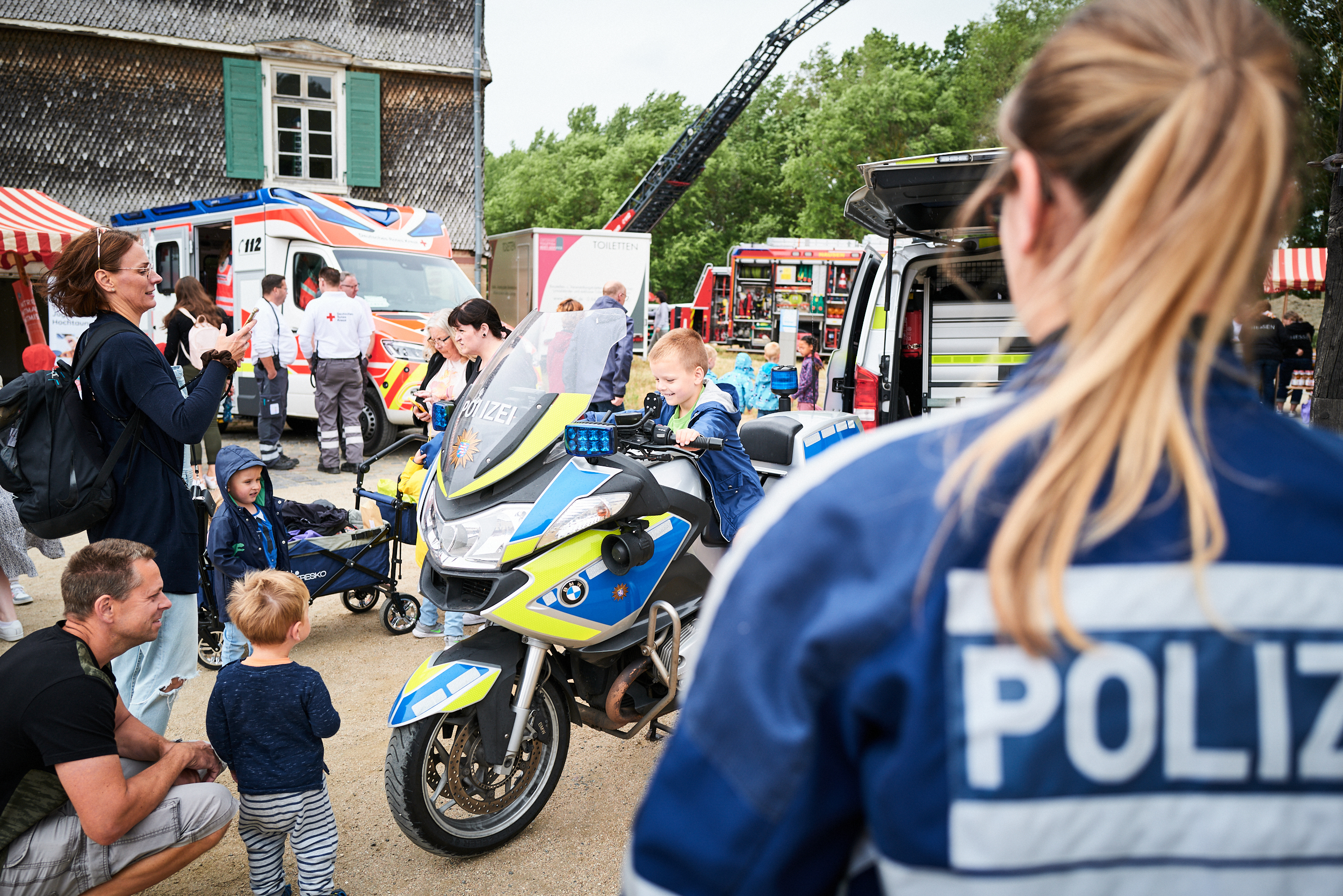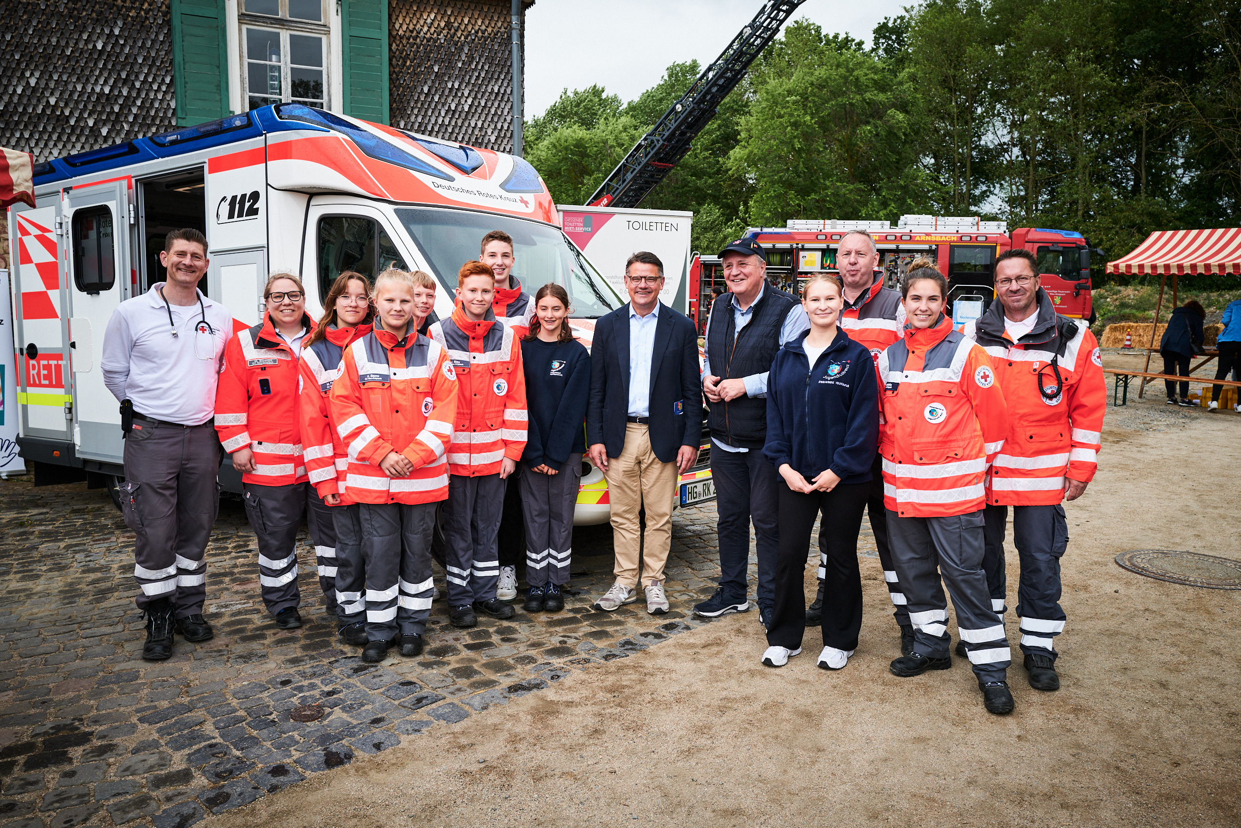 Ministerpräsident Boris Rhein beim Drillingstreffen 2023 mit Feuerwehreinsatzkräften im Hessenpark in Neu-Anspach.