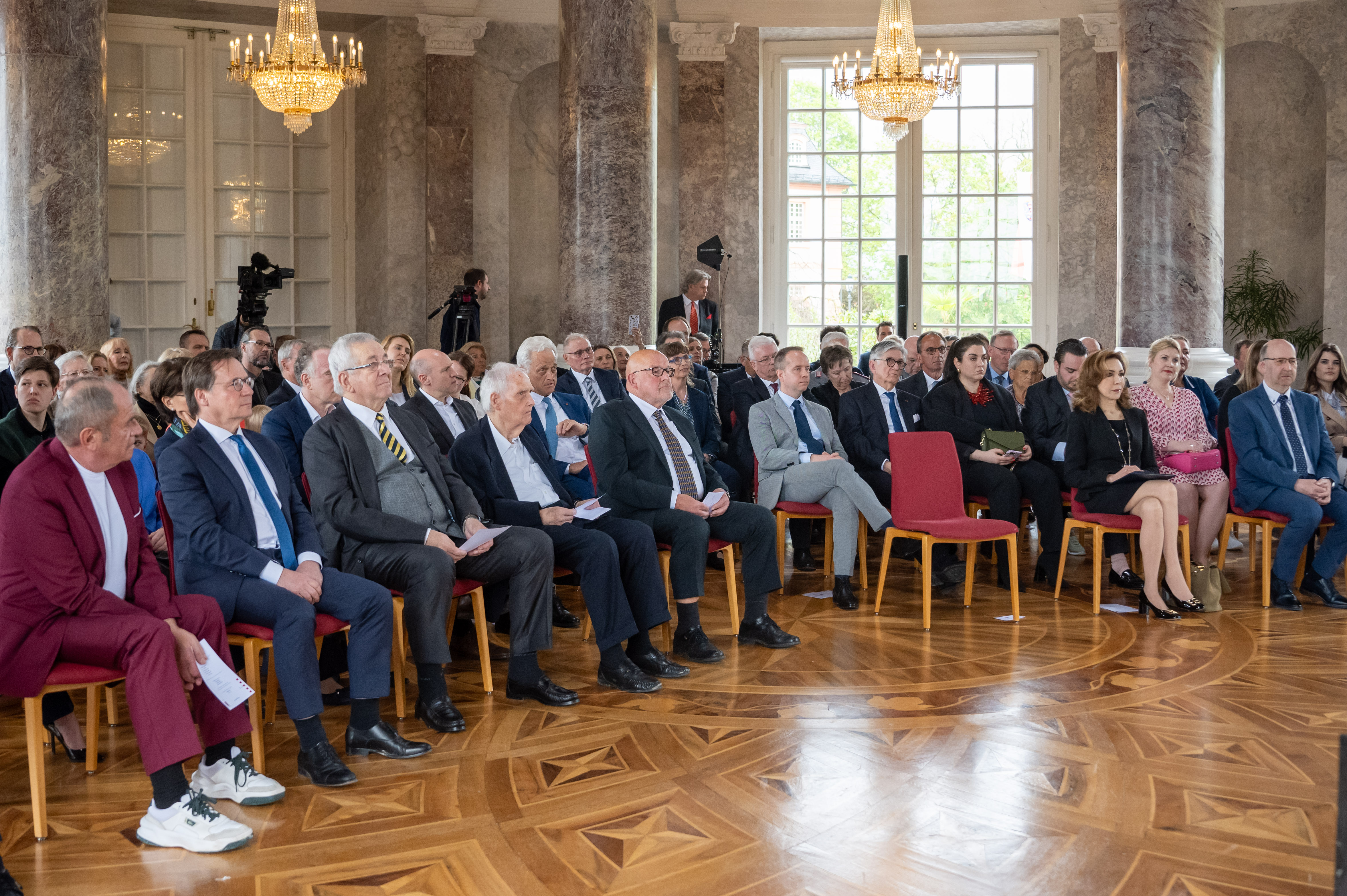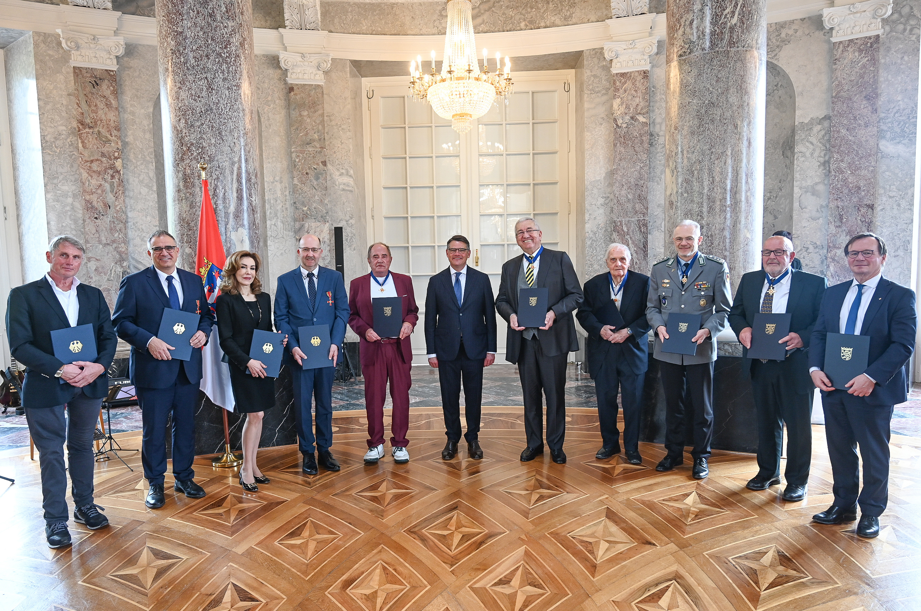 Ministerpräsident Rhein und Geehrte im Schloss Biebrich.