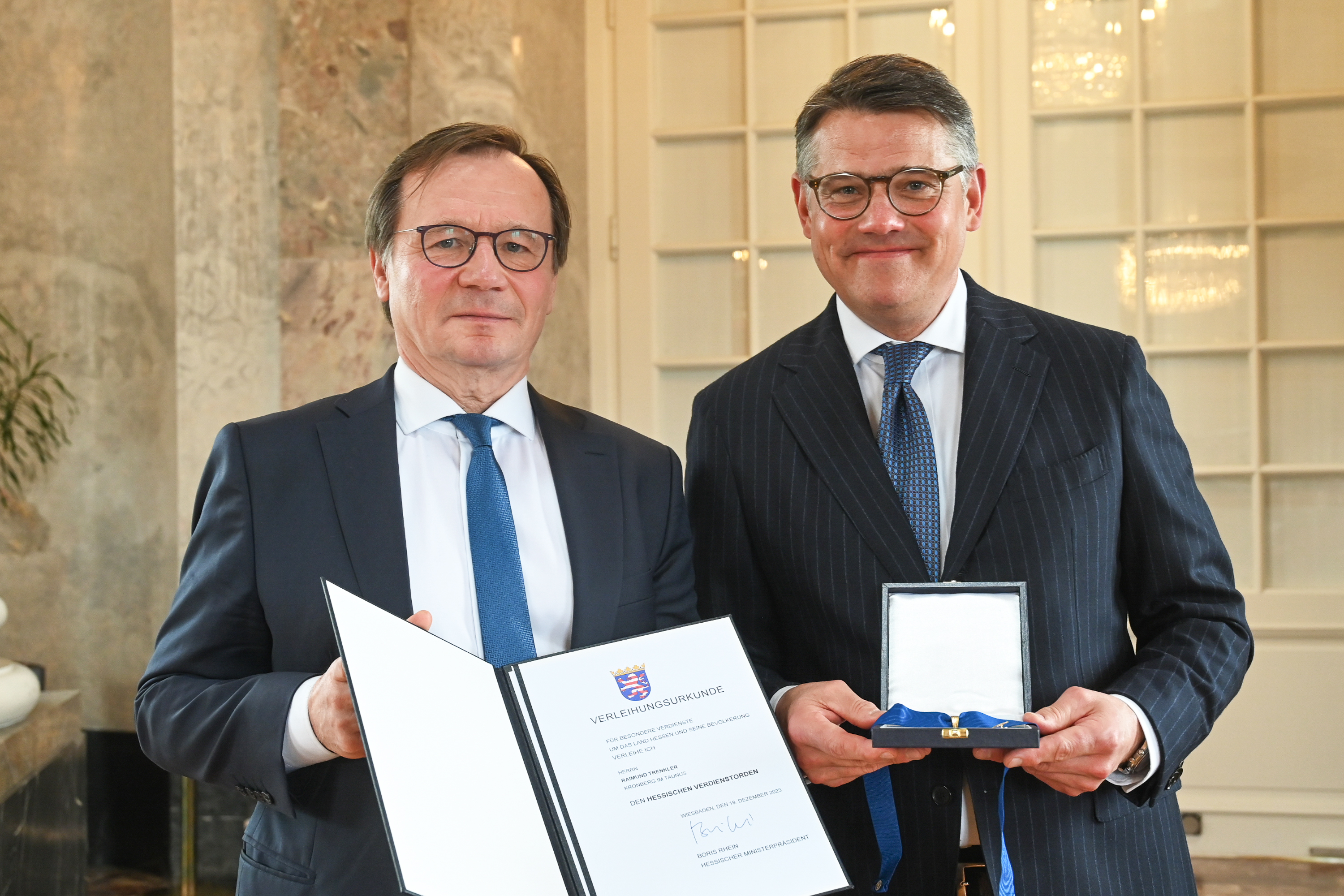 Ministerpräsident Boris Rhein überreichte Raimund Trenkler den Hessischen Verdienstorden.