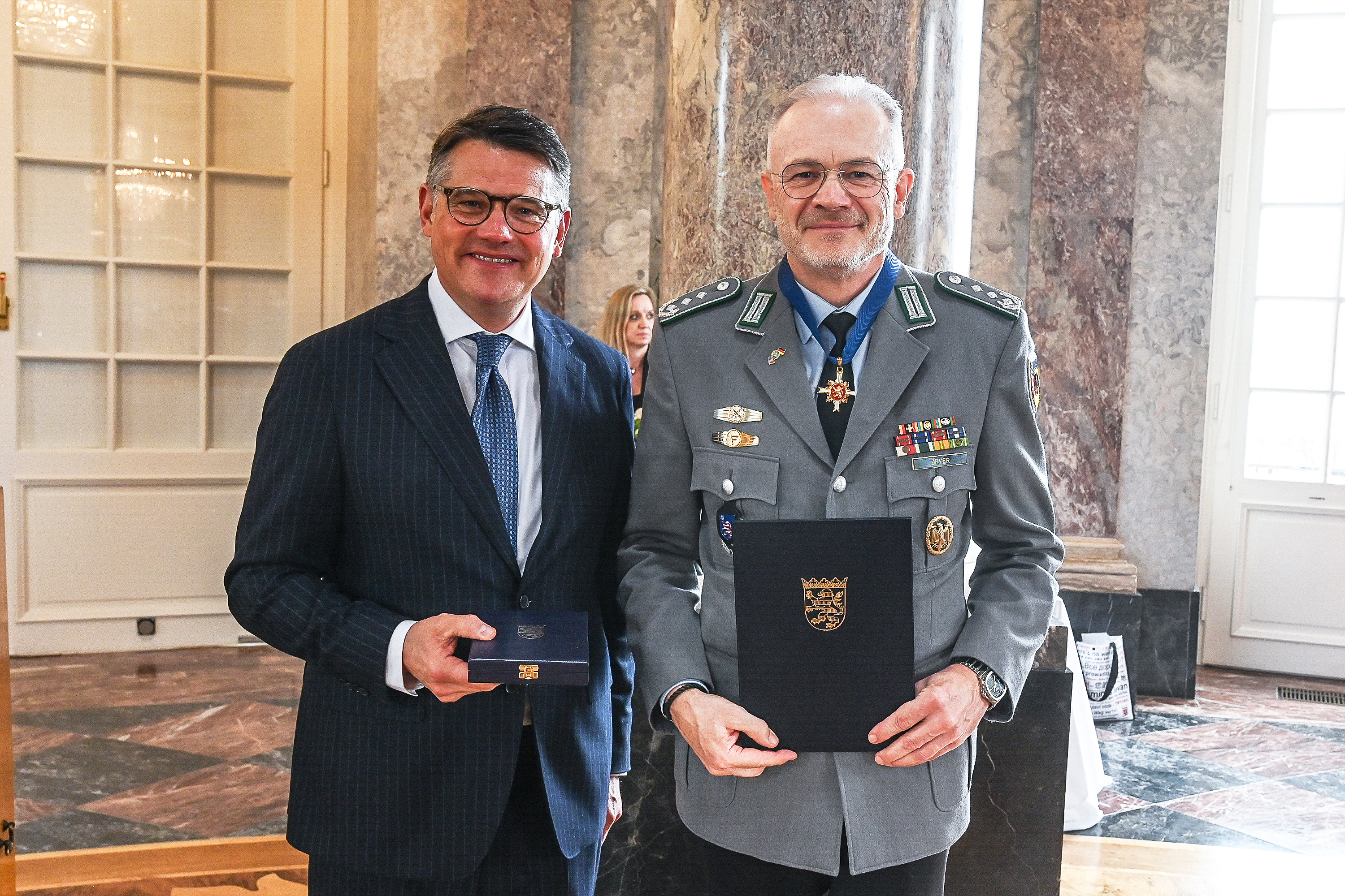 Ministerpräsident Boris Rhein überreichte Oberst Siegfried Zeyer den Hessischen Verdienstorden.