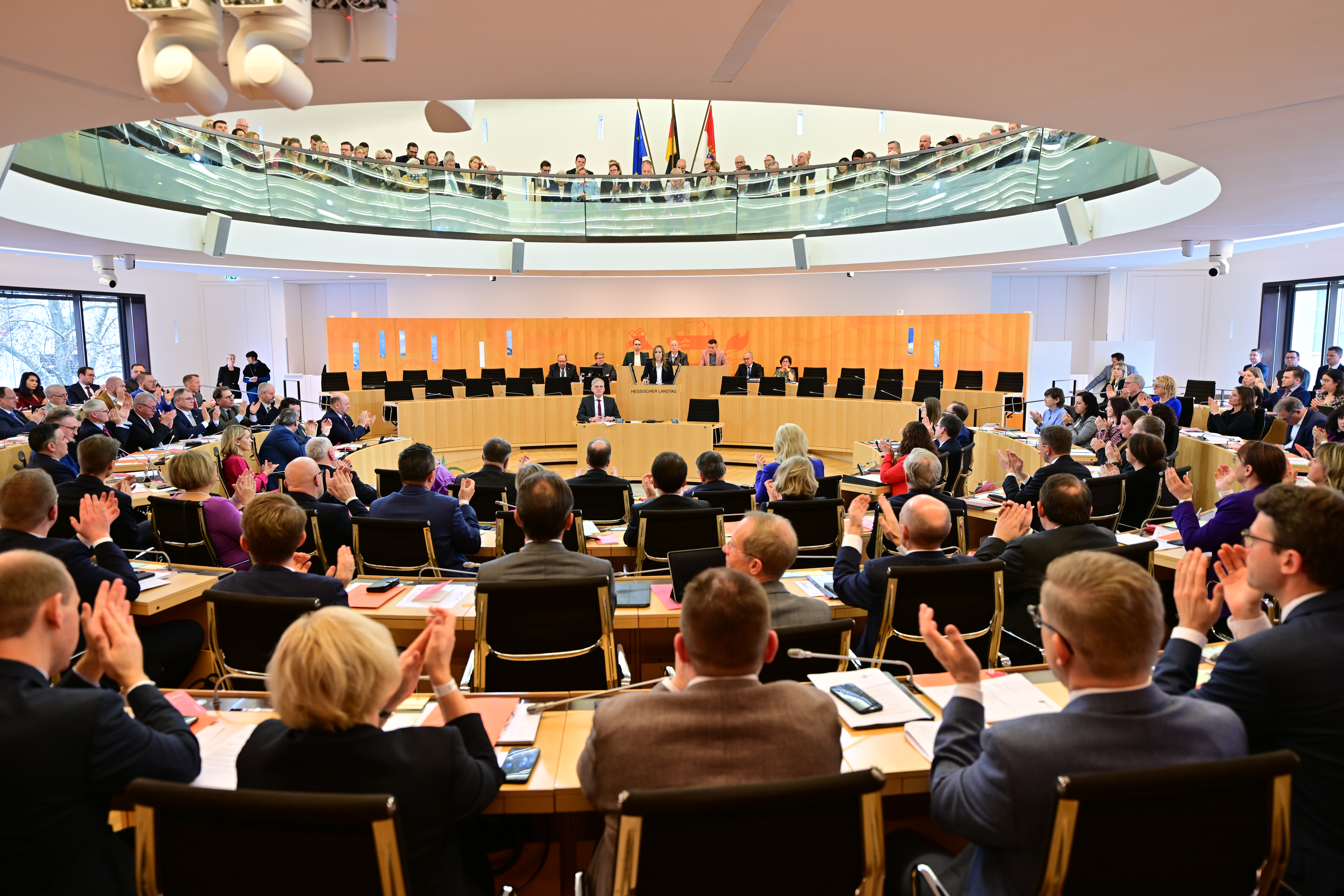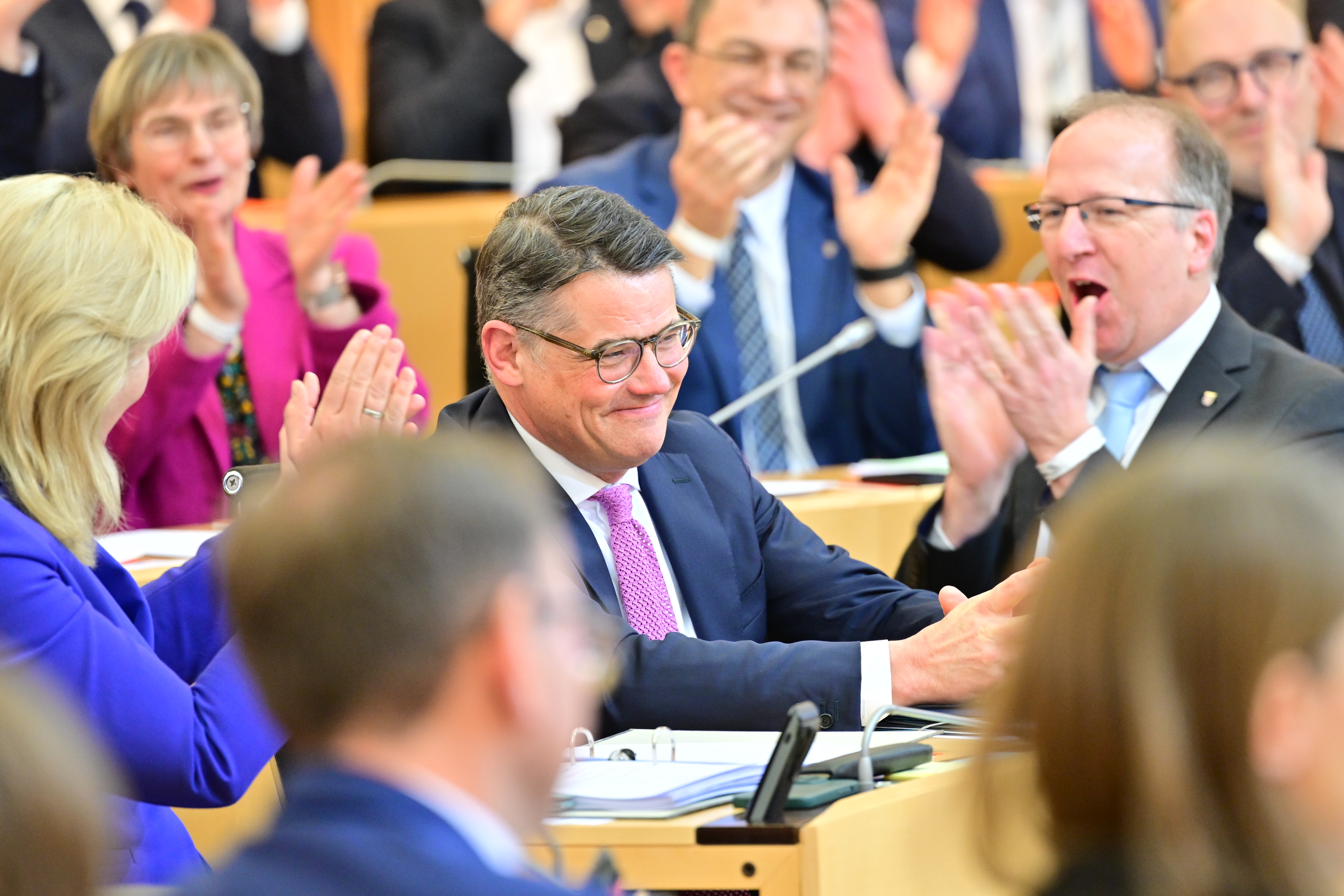 Abgeordnete des Hessischen Landtags gratulieren Boris Rhein zu seiner Wiederwahl als Ministerpräsident.