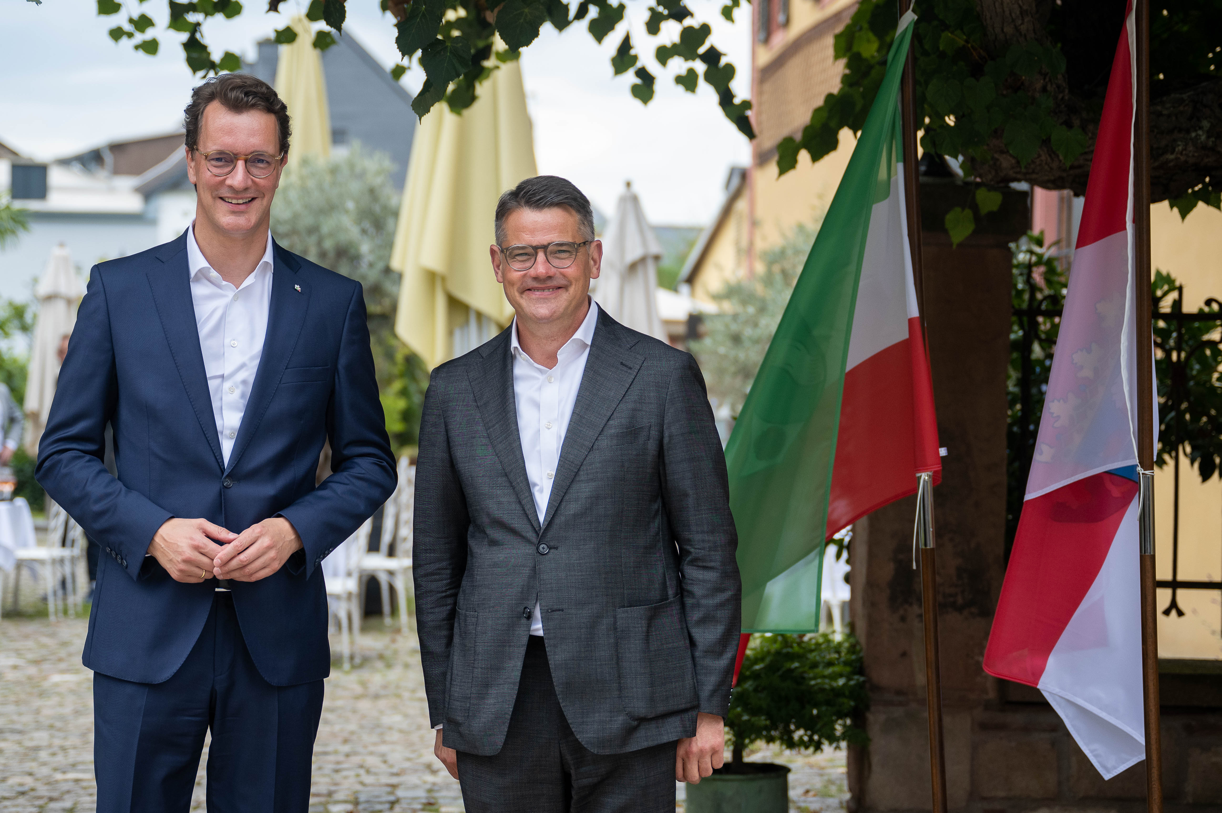 Ministerpräsident Boris Rhein und Alain Rousset, Präsident des Regionalrats der Nouvelle-Aquitaine, bei der Unterzeichnung des MoU.