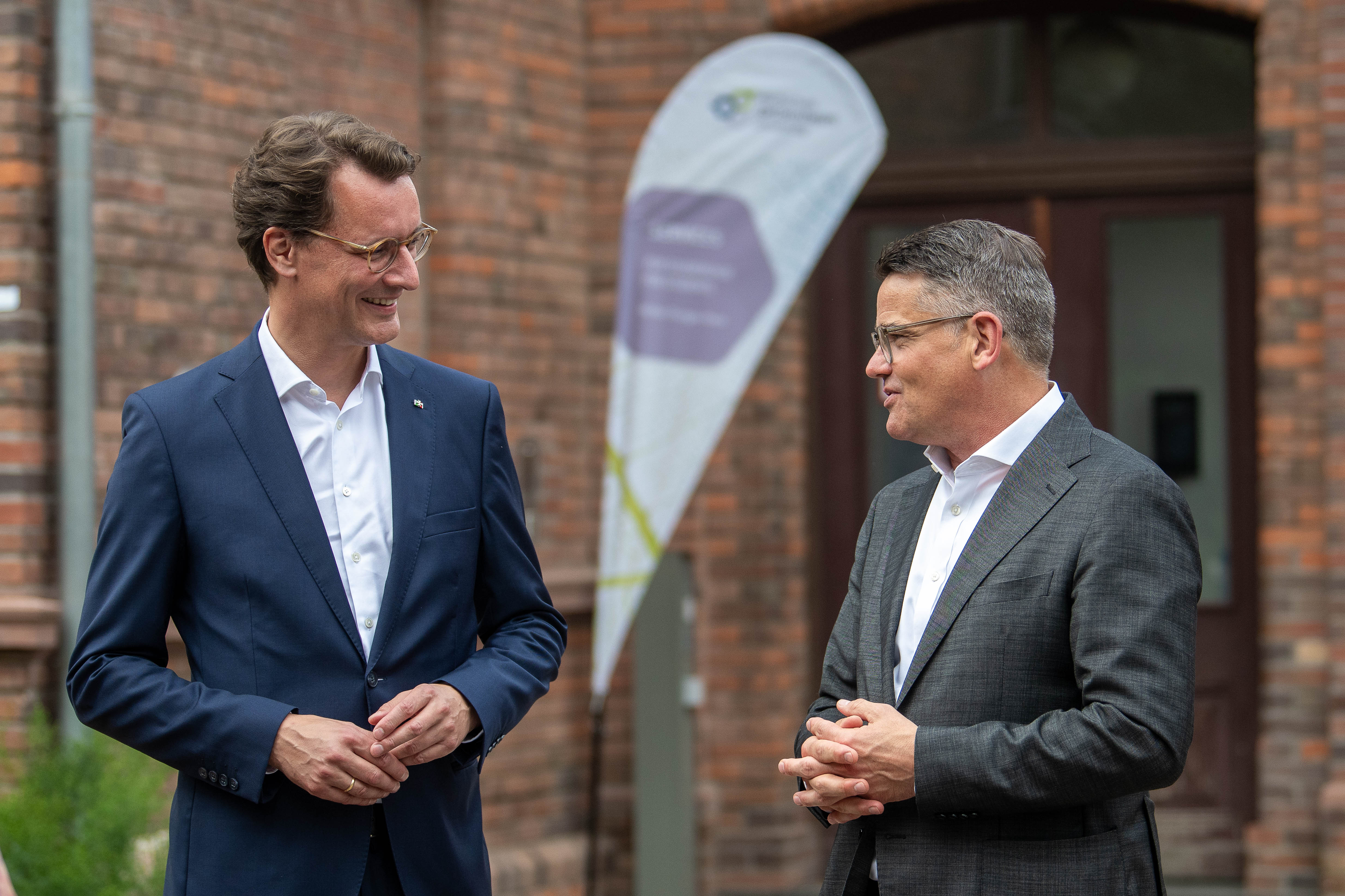 Ministerpräsident Rhein während der Gespräche im TechnoWest-Innovationspark. TechnoWest ist ein französisches Innovations- und Technologiezentrum, das sich auf die Förderung junger Unternehmen u.a. in den Bereichen Luft- und Raumfahrt, Verteidigung und Drohnentechnologie spezialisiert hat.