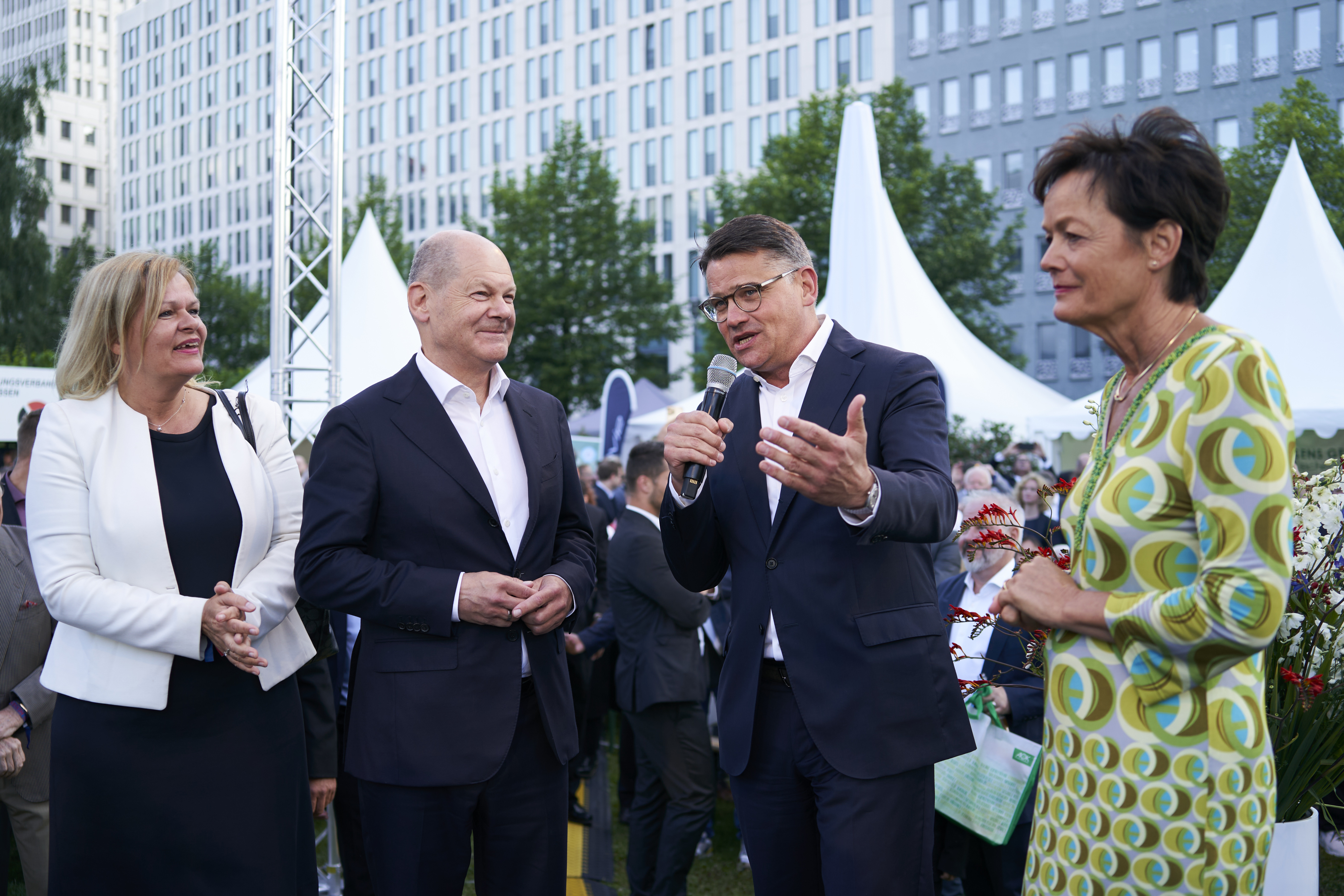 Als zwei der prominenten Gäste der Bundesebene haben Ministerpräsident Boris Rhein (2.v.r.) und Staatsministerin Lucia Puttrich (rechts) unter anderem Bundesinnenministerin Nancy Faeser (links) und Bundeskanzler Olaf Scholz (2.v.l.) auf dem Hessenfest in Berlin begrüßt.