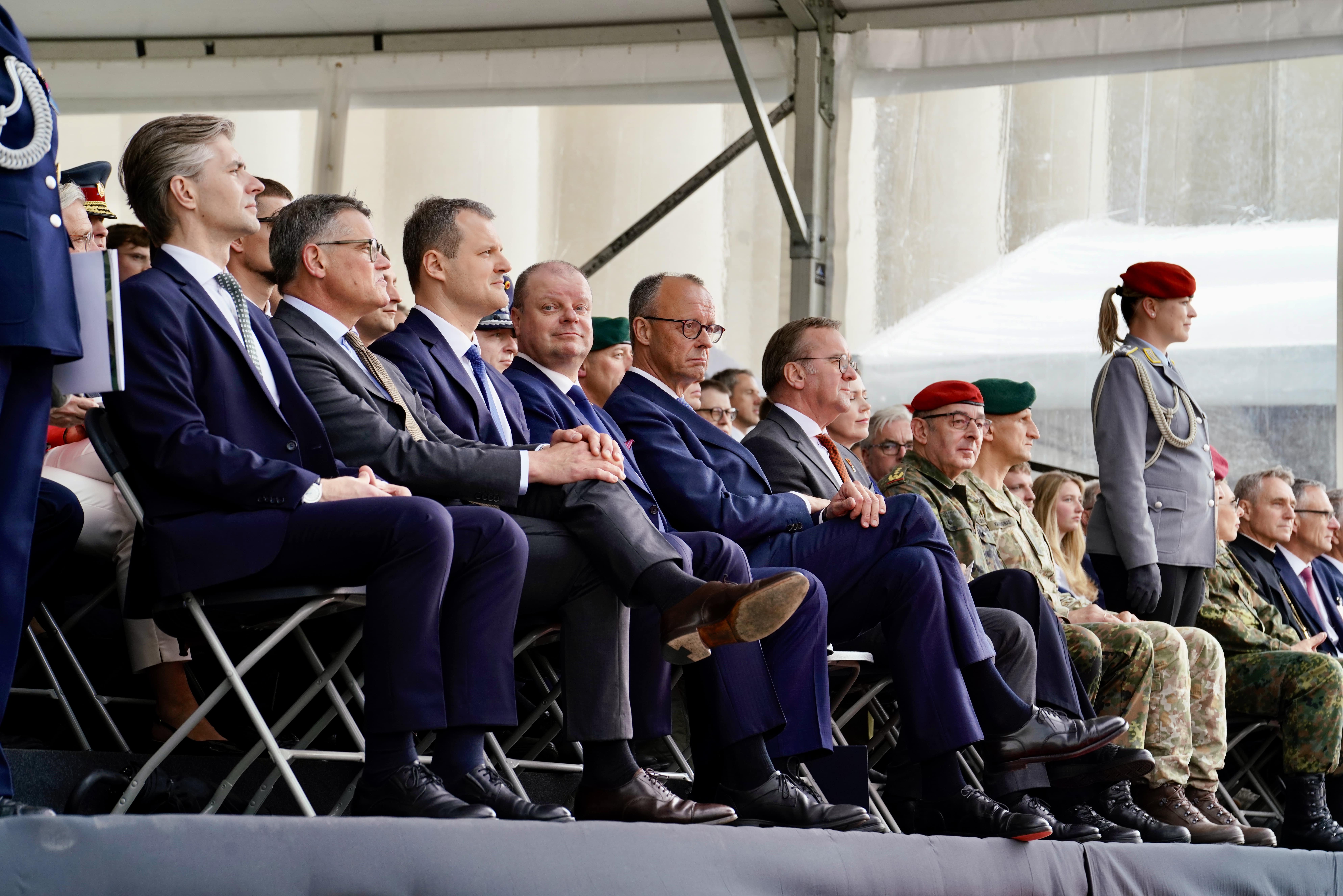 Litauens Außenminister Budrys, Ministerpräsident Rhein, Premierminister Paluckas, Parlamentspräsident Skvernelis, Bundeskanzler Merz, Bundesaußenminister Pistorius und Verteidigungsministerin Šakalienė (v. l. n. r.) bei der feierlichen Aufstellung der Panzerbrigade 45 in Vilnius