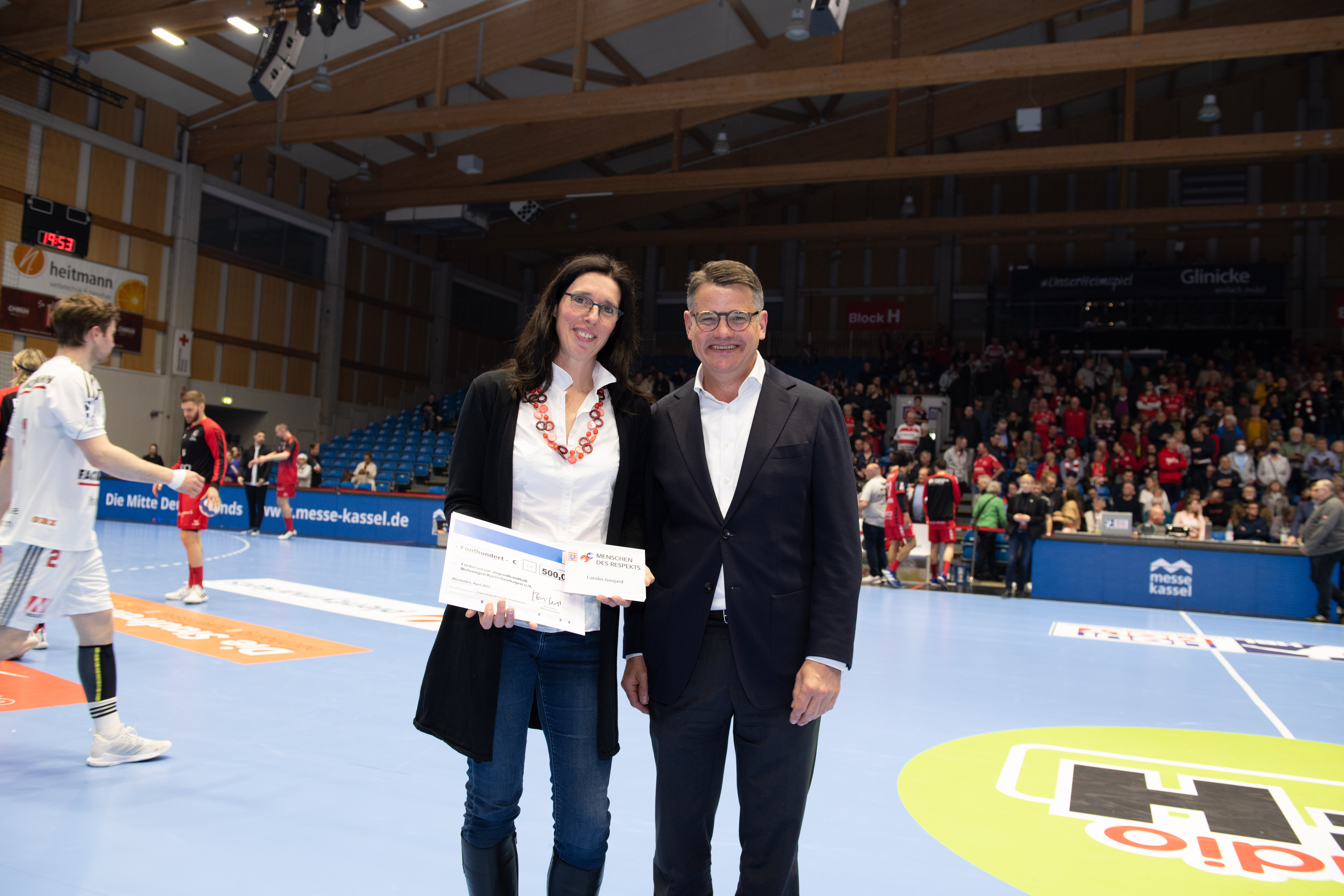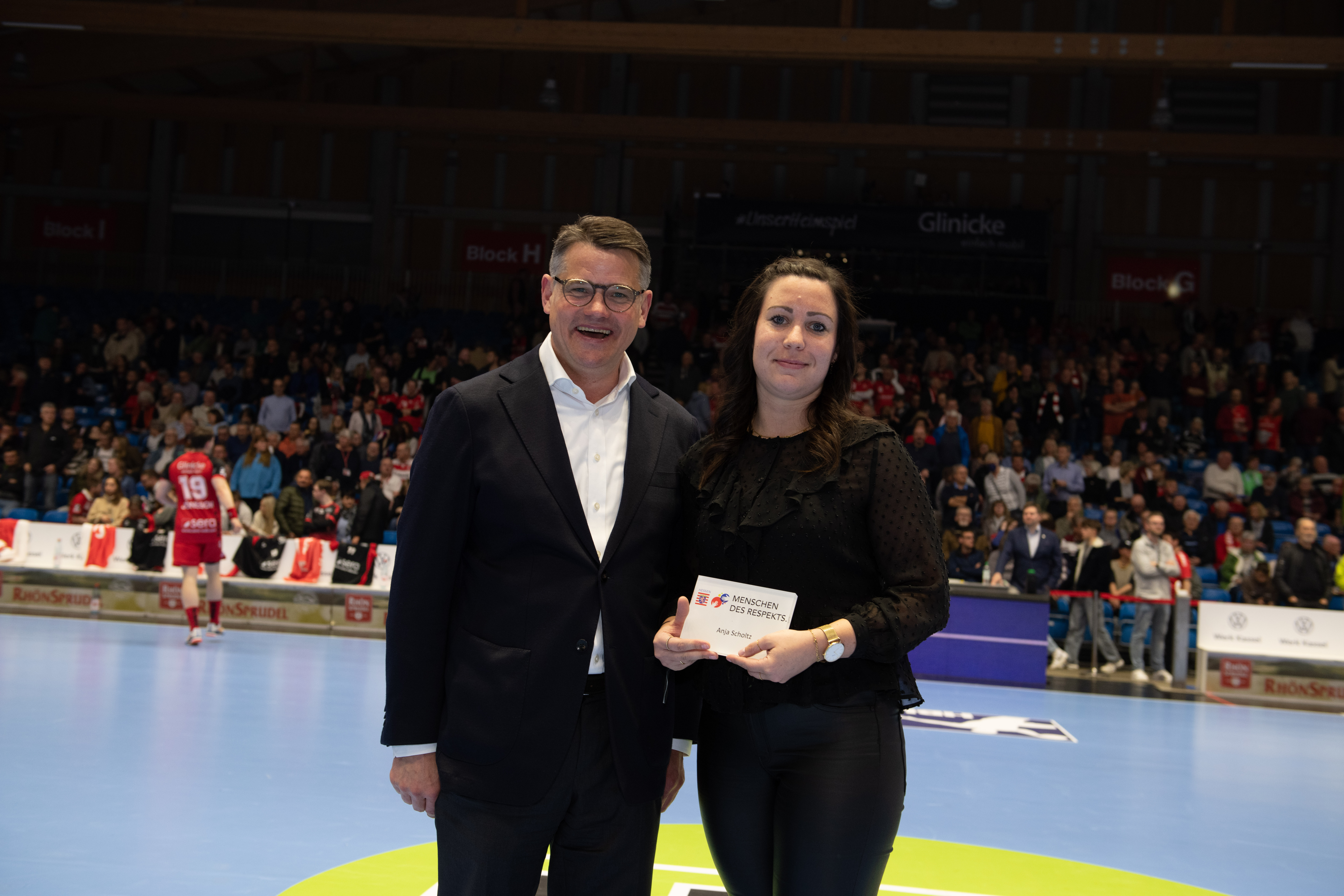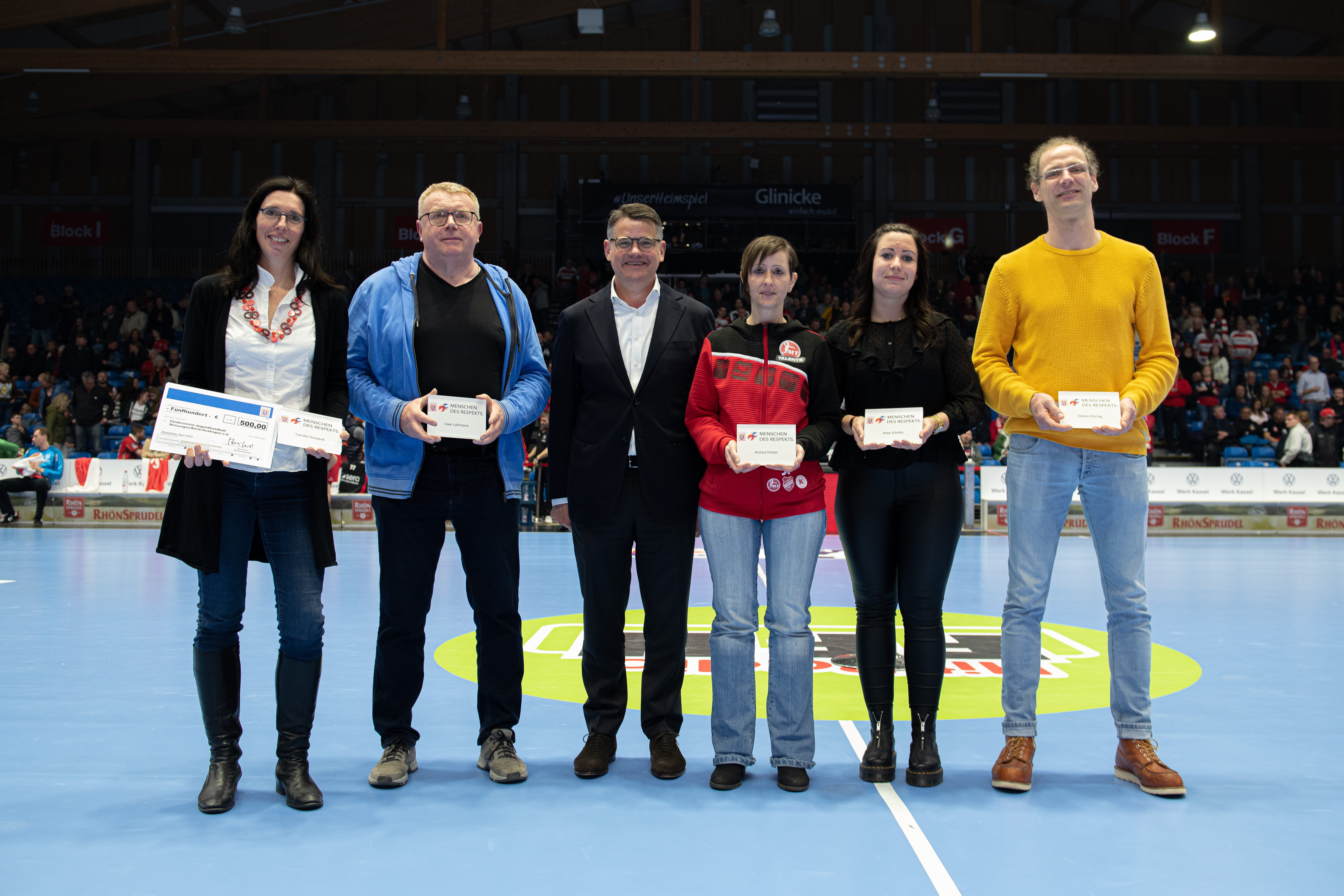 Carolin Goujard, Uwe Lohmann, Anja Scholtz, Stefan Döring, Ellen Fehr und Jessica Fetzer erhielten die Auszeichnung vom Regierungschef in der Spielpause der Partie des MT Melsungen gegen 19.35 Uhr. „Mit ihrem freiwilligen Einsatz stärken sie nicht nur das Vereinsleben der nordhessischen Sportvereine, sondern unterstützen mit ihrem Handeln auf vielfältige Weise das Ehrenamt. Hessen ist auch deshalb stark, weil die Menschen füreinander einstehen, sich helfen und weil sie Respekt voreinander haben. Und genau vor diesem Engagement habe ich großen Respekt“, sagte Rhein am Donnerstag in der Rothenbach-Halle in Kassel.