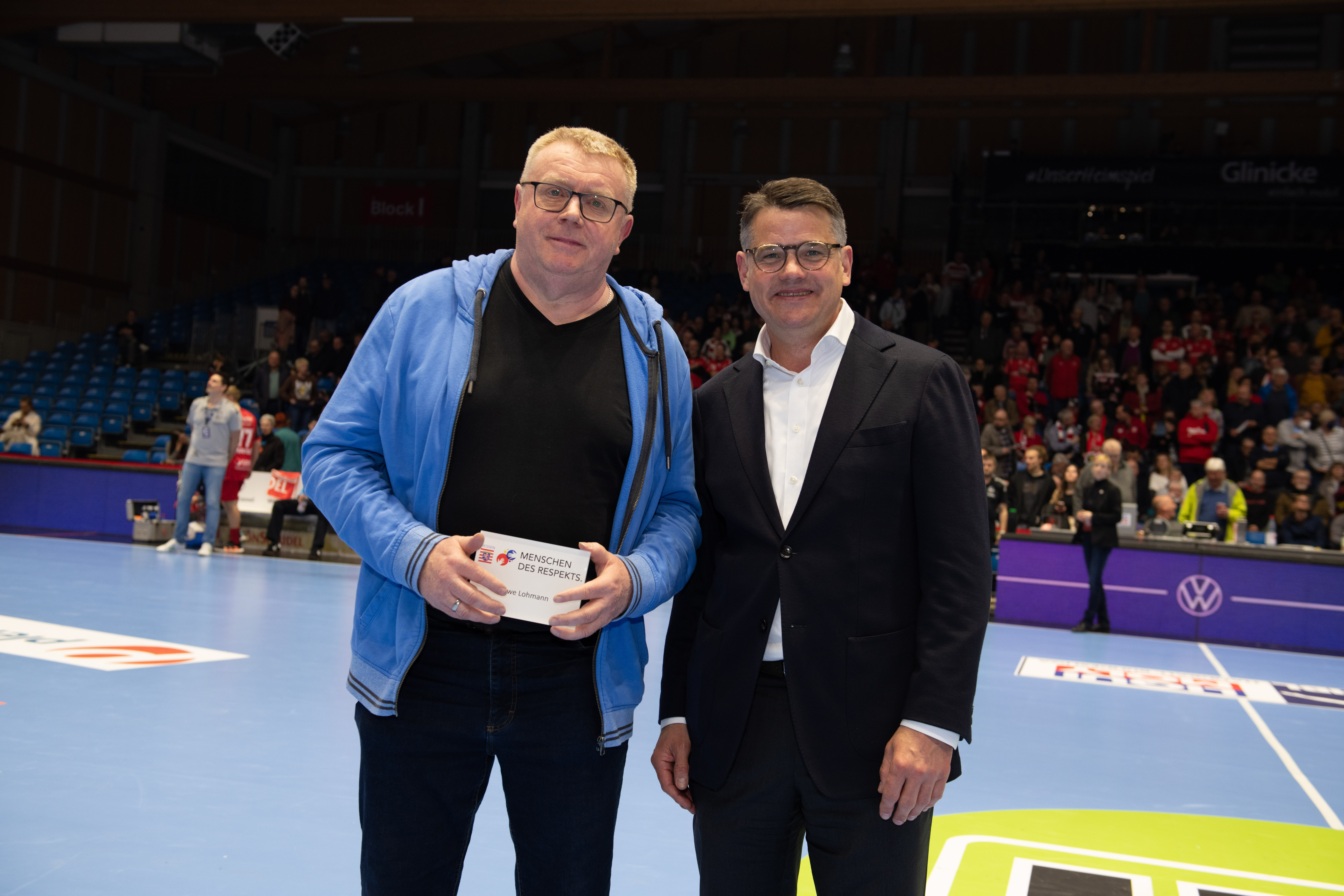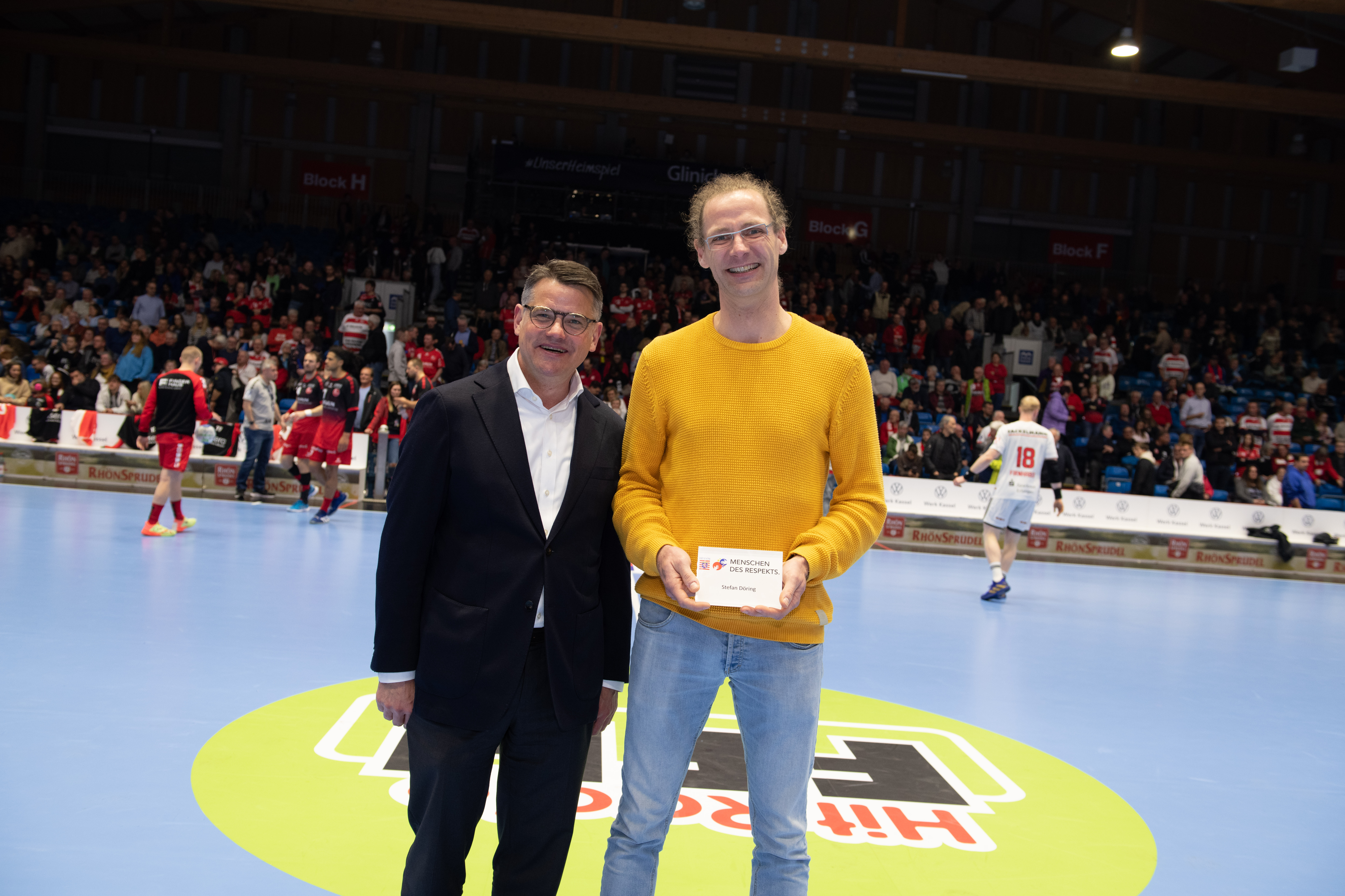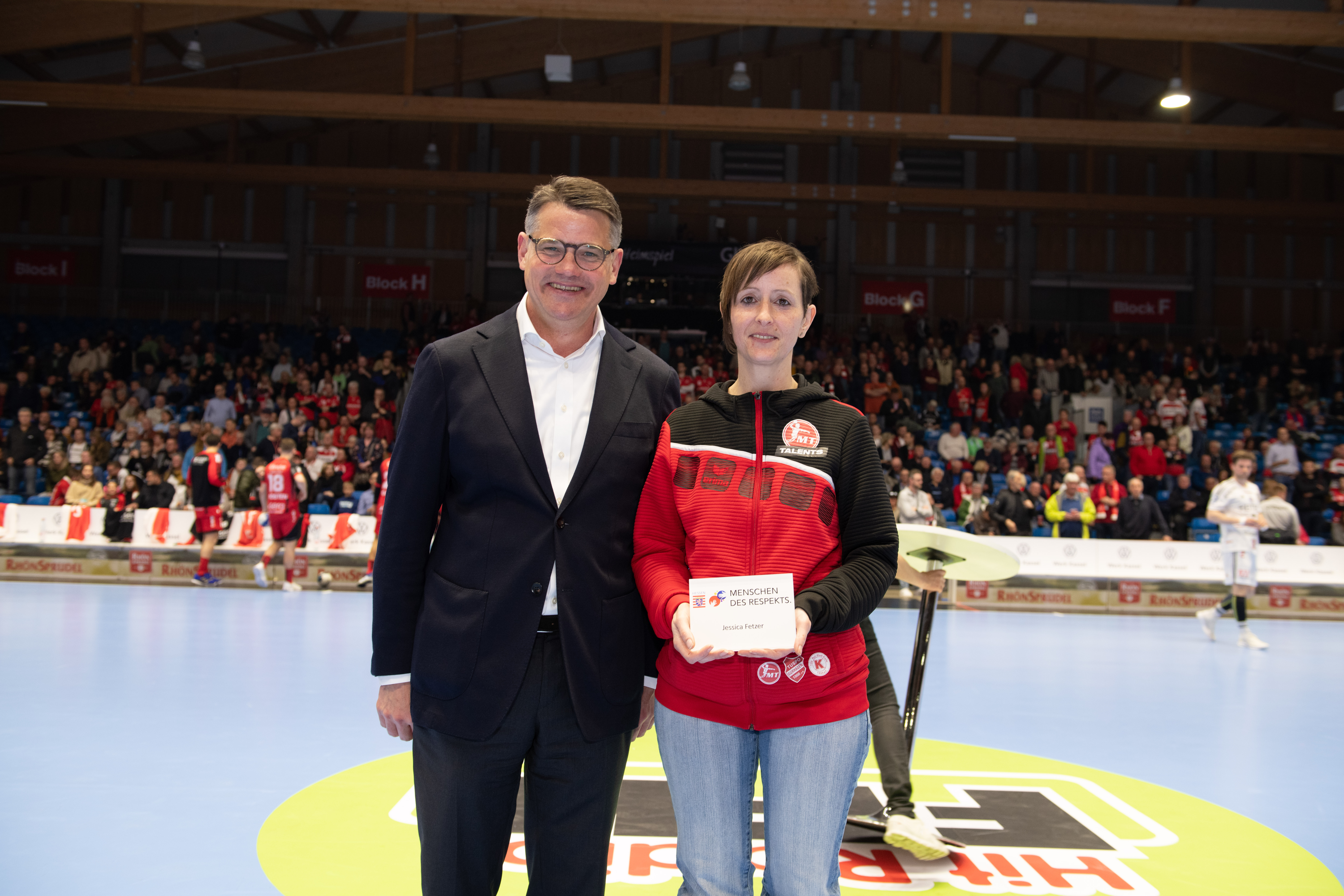 Carolin Goujard, Uwe Lohmann, Anja Scholtz, Stefan Döring, Ellen Fehr und Jessica Fetzer erhielten die Auszeichnung vom Regierungschef in der Spielpause der Partie des MT Melsungen gegen 19.35 Uhr. „Mit ihrem freiwilligen Einsatz stärken sie nicht nur das Vereinsleben der nordhessischen Sportvereine, sondern unterstützen mit ihrem Handeln auf vielfältige Weise das Ehrenamt. Hessen ist auch deshalb stark, weil die Menschen füreinander einstehen, sich helfen und weil sie Respekt voreinander haben. Und genau vor diesem Engagement habe ich großen Respekt“, sagte Rhein am Donnerstag in der Rothenbach-Halle in Kassel.
