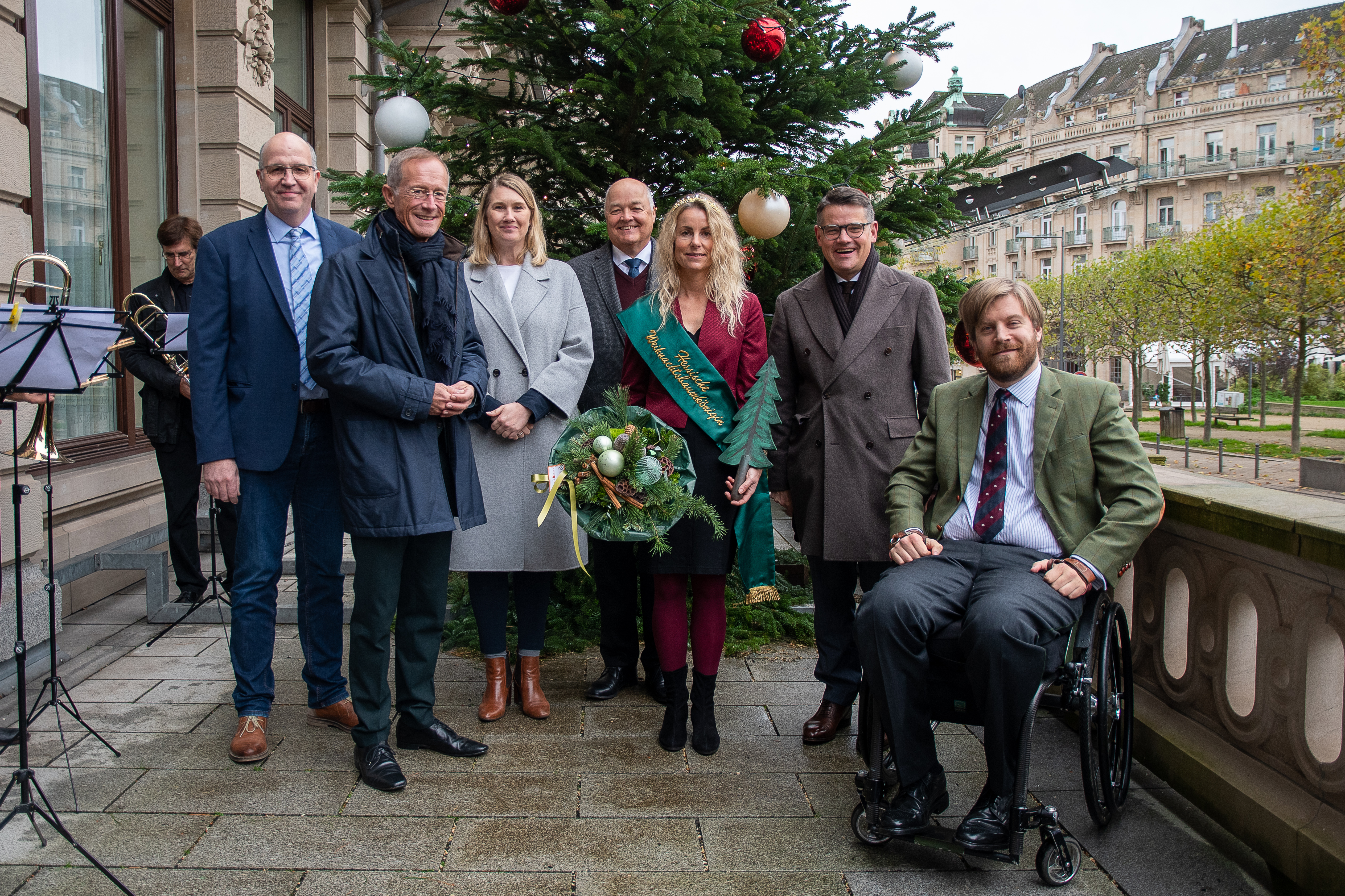 Der Vorsitzende des Waldbesitzerverbandes, Carl Anton Prinz zu Waldeck und Pyrmont, überreichte den prächtigen Baum feierlich gemeinsam mit der hessischen Weihnachtsbaumkönigin Marina Weinreich. Die Nordmanntanne stammt natürlich aus Hessen und lädt, geschmückt mit weißen und roten Kugeln sowie energiesparende LED-Leuchten zum Verweilen und Innehalten ein.