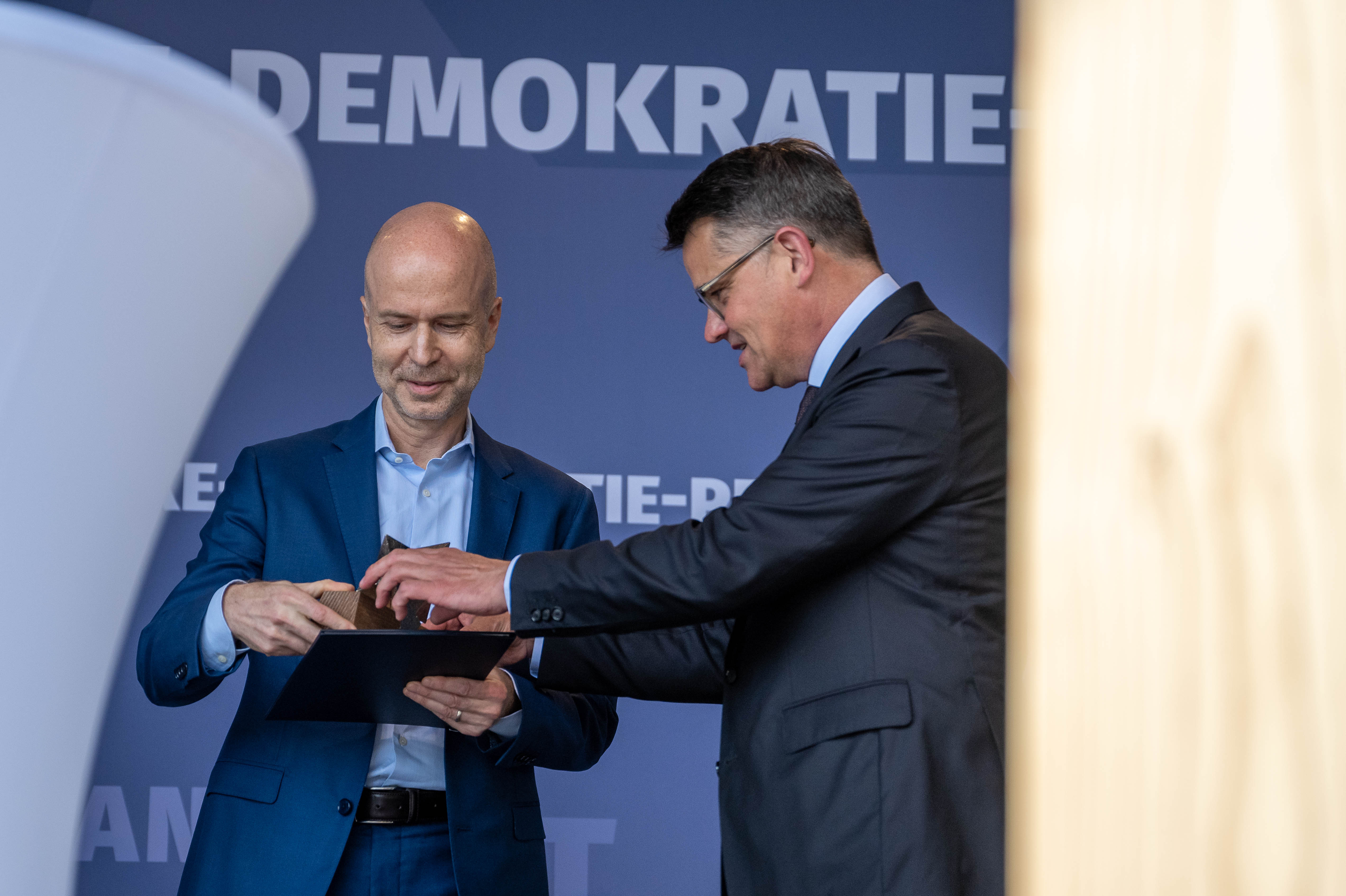 „Beide Preisträger leben und verkörpern in beeindruckender Weise die Werte, die Walter Lübcke vertreten und vorgelebt hat. Er war ein aufrechter und mutiger Demokrat, der sich unermüdlich für Freiheit, Toleranz und Respekt im gesellschaftlichen Miteinander eingesetzt hat“, sagte der Regierungschef am Donnerstag in Wolfhagen. Jörg Eigendorf nahm den Preis dort stellvertretend für seine Frau entgegen. Der Ministerpräsident überreichte zudem Vertreterinnen und Vertretern der Walter-Lübcke-Schule die Auszeichnung. Die Hessische Landesregierung vergibt den Preis im Gedenken an den ermordeten Kasseler Regierungspräsidenten damit zum zweiten Mal. Geehrt werden Persönlichkeiten und Institutionen, die sich in besonderer Weise für den gesellschaftlichen Zusammenhalt und die Demokratie engagieren.