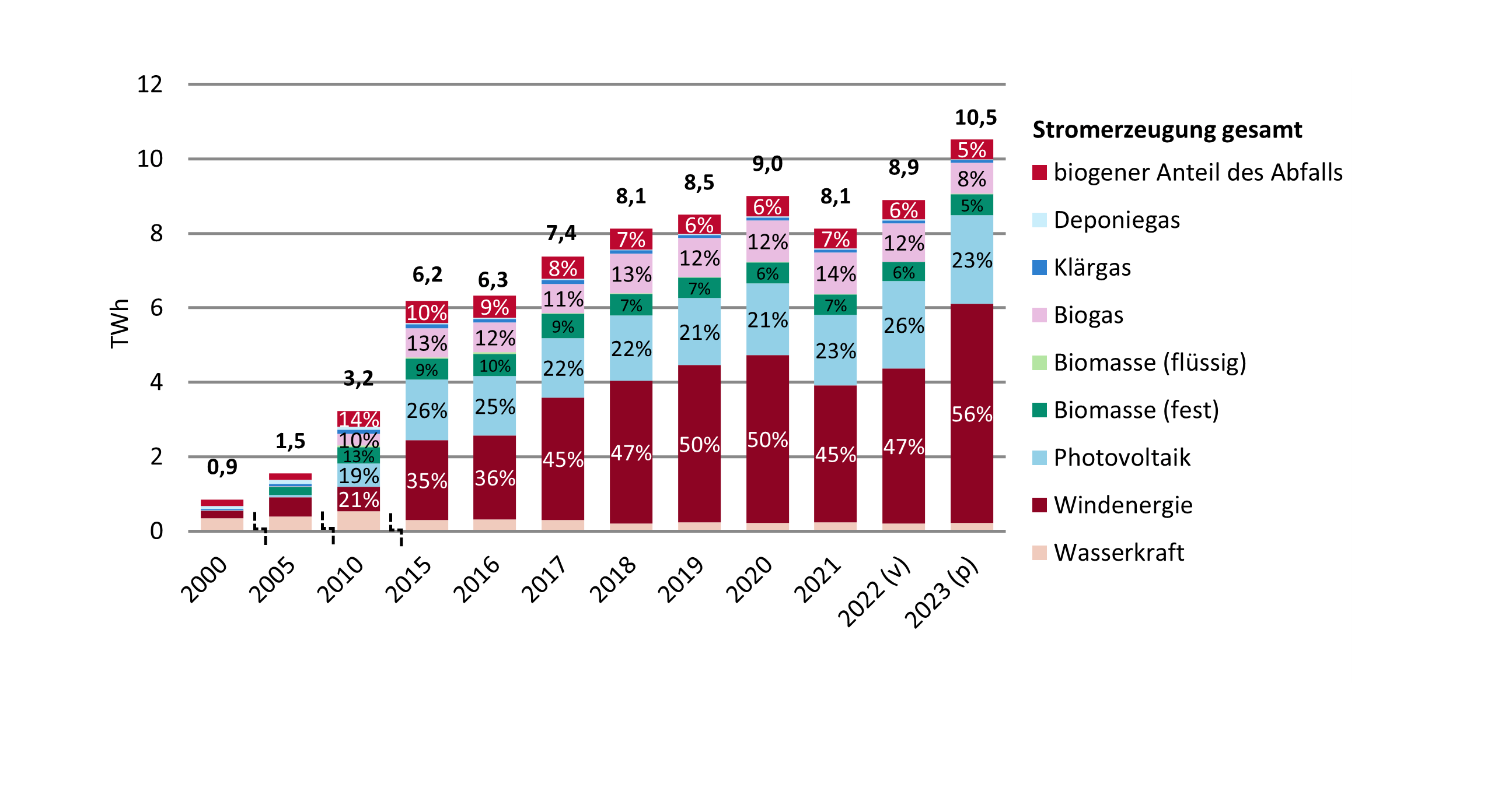 Der Ausbau der erneuerbaren Energien schreitet weiter voran: Insgesamt sind im Jahr 2023 erneuerbare Energieanlagen mit einer Leistung von 847 Megawatt (MW) neu installiert worden, was knapp einer Verdopplung im Vergleich zum Vorjahreszubau entspricht. Haupttreiber beim Zubau ist aktuell die Photovoltaik: Nachdem in 2022 bereits Anlagen mit insgesamt 398 MW Leistung installiert wurden, wurde dieser Wert im Jahr 2023 mit 680 MW zugebauter Leistung erneut deutlich übertroffen. Die vorläufigen Ausbauzahlen für das erste Halbjahr 2024 lassen auf einen erneuten Rekordzubau für das Jahr 2024 schließen (358 MW).