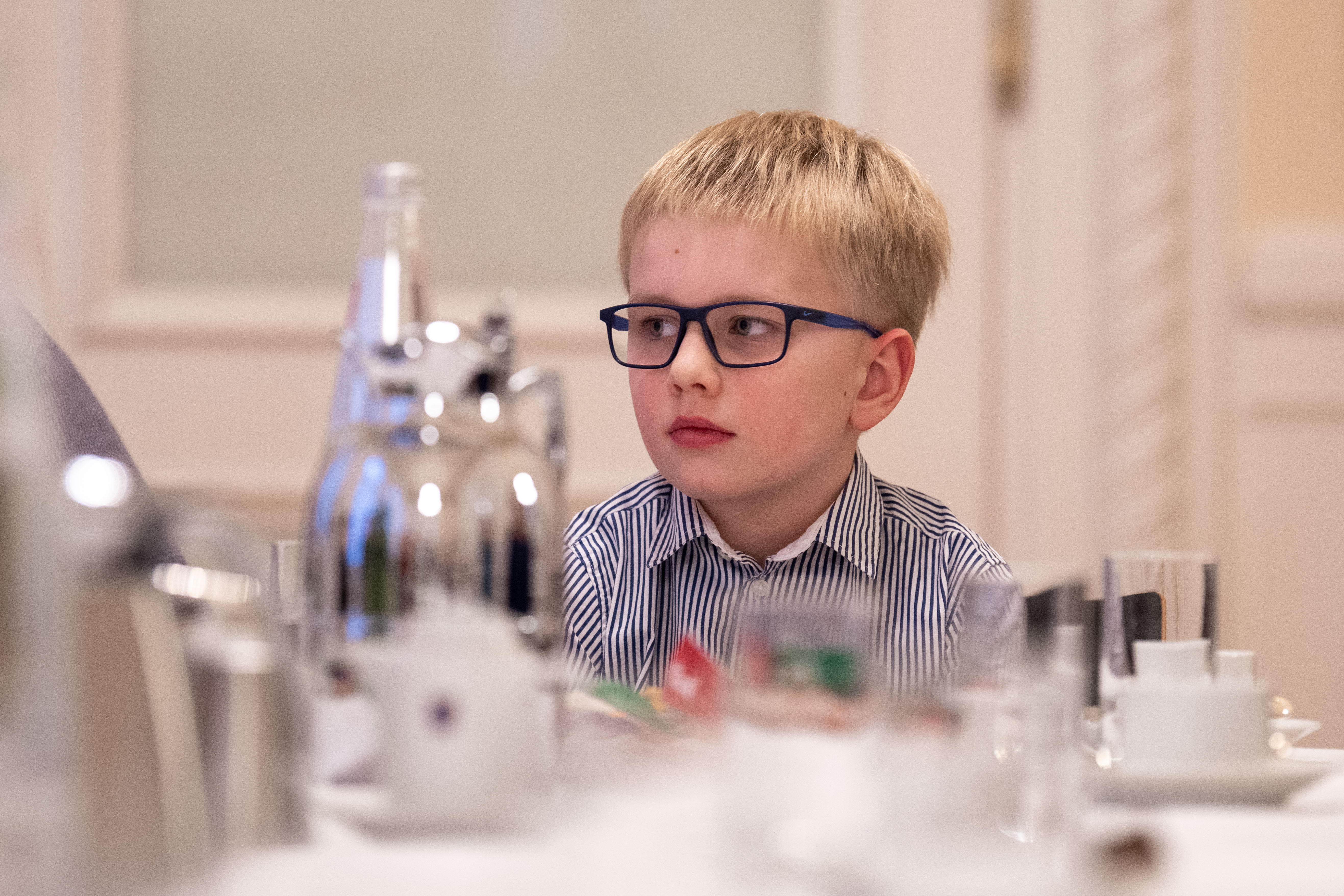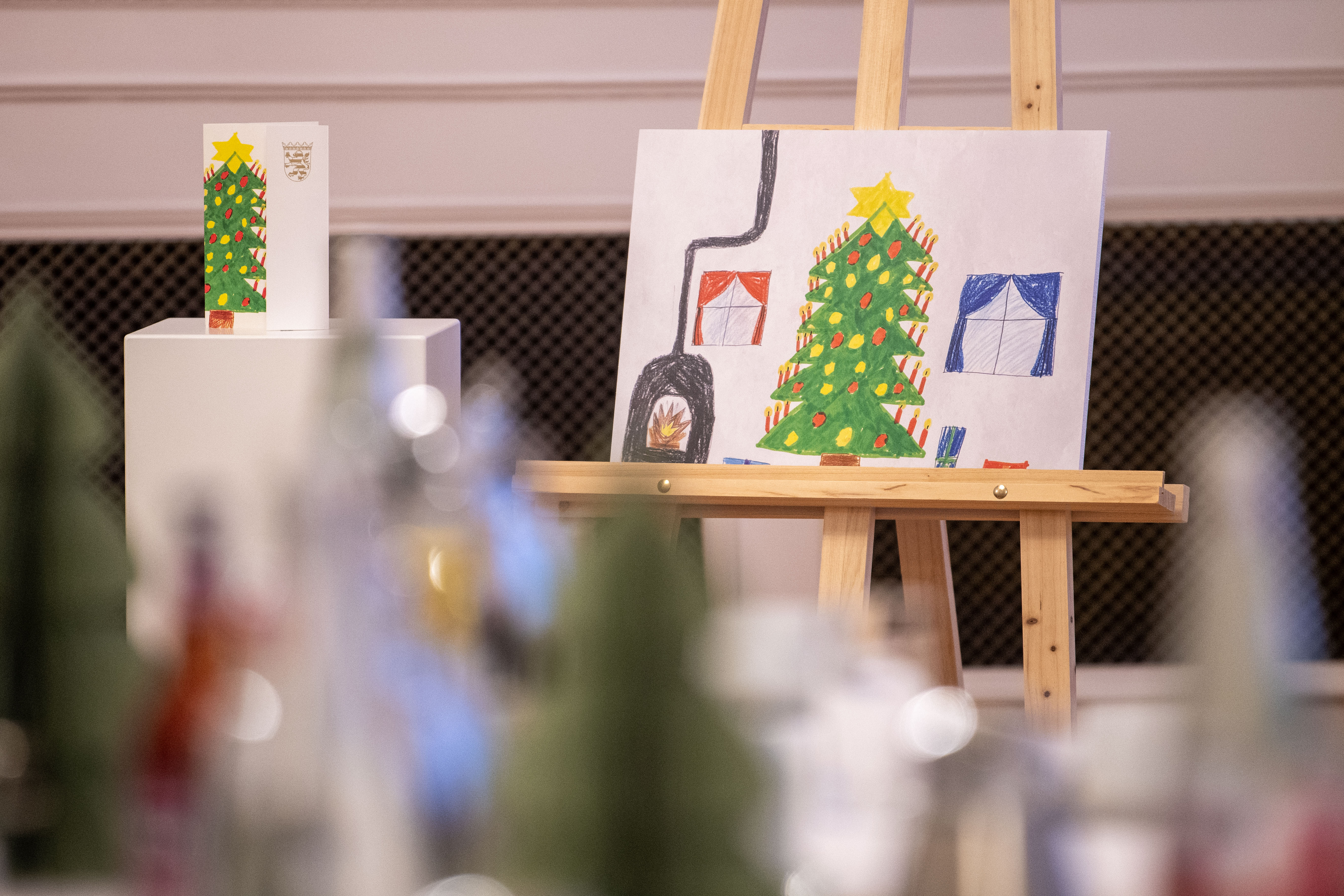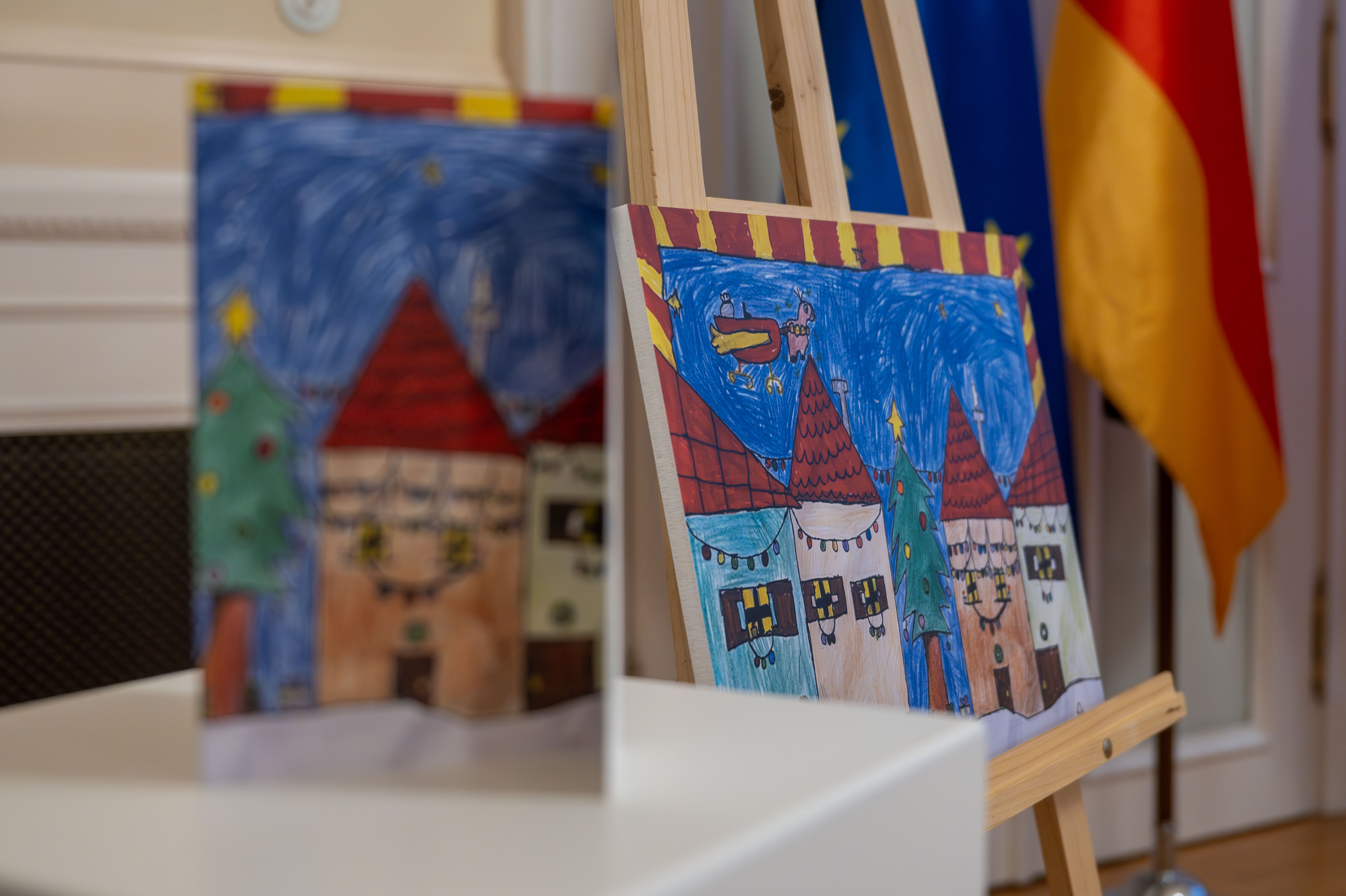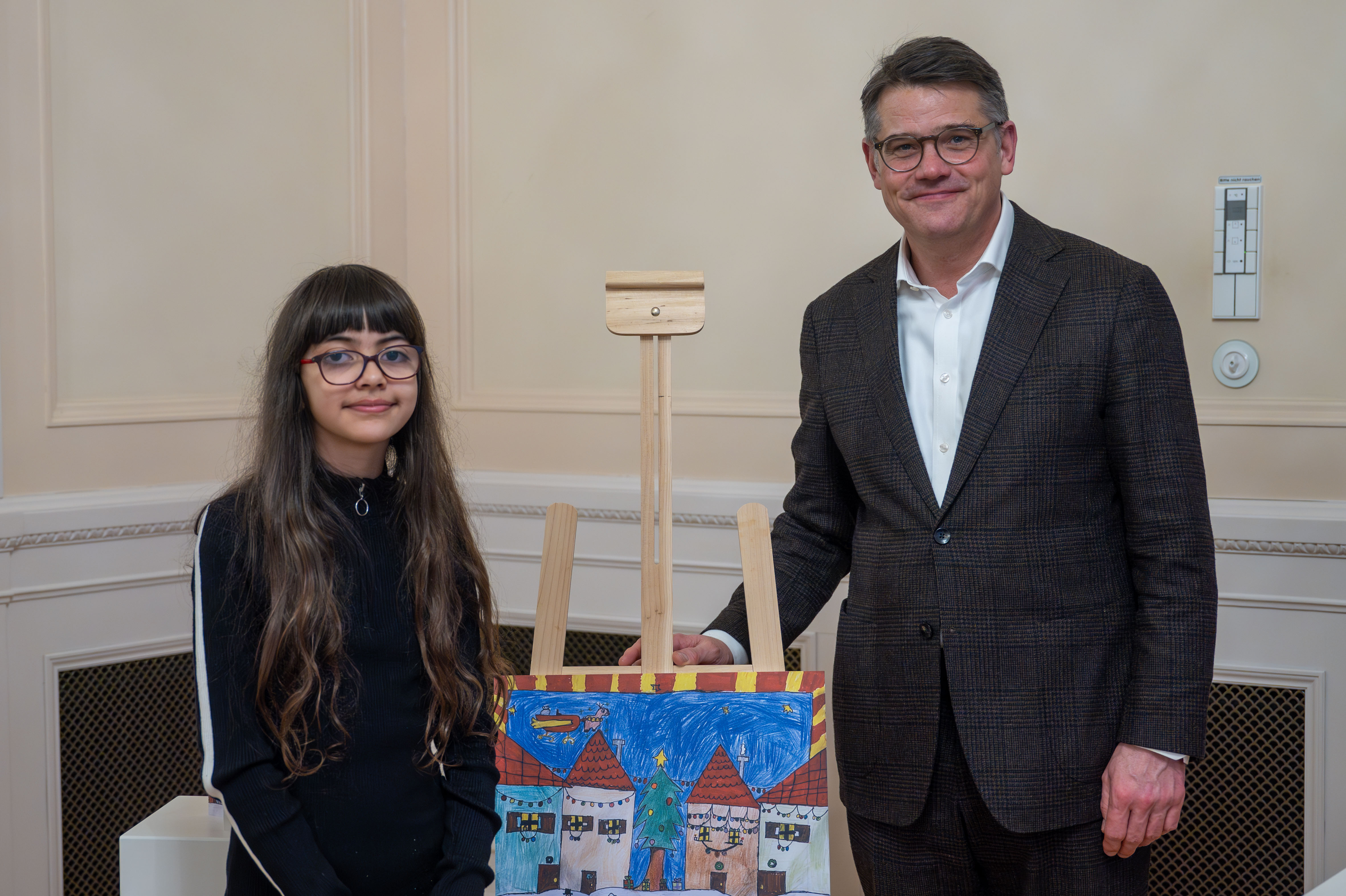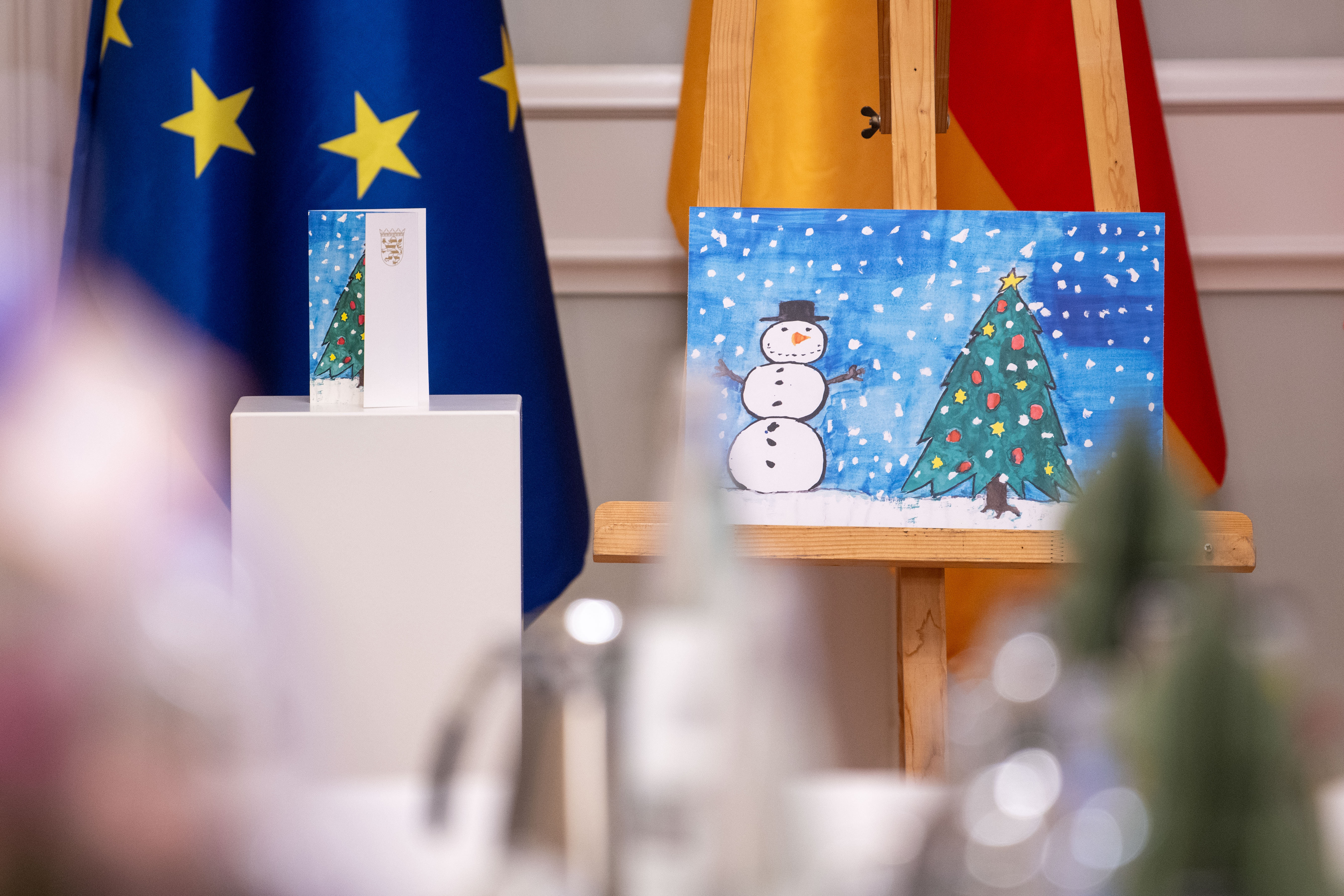 Die drei Siegermotive hat der Ministerpräsident persönlich unter allen Einsendungen ausgewählt. Hinter den Bildern stehen natürlich echte Kinder. Die zugehörigen Künstlerinnen und den Künstler hat Boris Rhein also zu einem kleinen Fest in die Staatskanzlei eingeladen. Zusammen mit ihren Familien durften Sonja, Sara und Felix mit dem hessischen Ministerpräsidenten zum Adventskränzchen kommen.